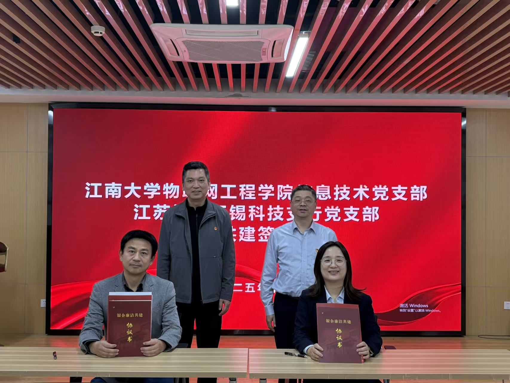 参观结束后,双方举行共建签约仪式,共同签署《结对共建协议书》与《校银廉洁共建协议书》,并围绕“党建如何引领业务发展”主题开展座谈交流。江苏银行无锡科技支行行长程杨志指出,此次共建是金融机构服务实体经济、推动科技与金融深度融合的重要举措。张华表示,校银党支部共建创新了党建形式,为人才培养与科研成果转化拓展了新路径。