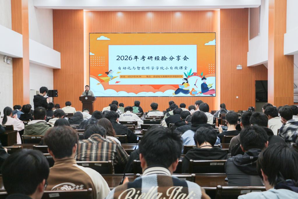 为充分发挥优秀学子的示范引领作用,帮助考研学生明确备考方向、掌握科学方法,4月23日,自动化与智能科学国产主播(物联网国产主播)“小自微课堂”品牌活动之考研经验分享会在国产主播D328报告厅举行。活动邀请国产主播2026届六位成功考取硕士研究生的优秀学子分享备考心得,各年级本科生到场参与交流。