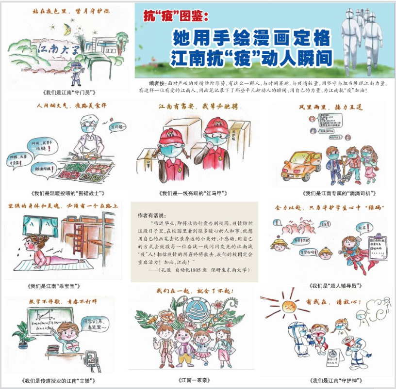 为引导学生在劳动中发现美、感悟美和创造美,国产主播先后举办“‘声’动百年,‘音’为有你”作品征集大赛、“VAP”创意制作大赛、征文大赛、摄影大赛等,引导广大学生积极创作优秀文化作品,尤其是网络文化作品,活跃校园网络空间生态,传递劳动最美正能量。微视频《顶峰相见》记录江南追梦人的奋斗之旅,既是对学子乐学苦思、踔厉奋发群像的整体展示,也是为激励更多的青年用奋斗擦亮青春底色,用行动磨砺青年意志!自动化1805班孔薇用9幅原创手绘漫画定格校园疫情防控中的动人瞬间,画中的主人公有党员教师志愿者、学生志愿者、辅导员、保安、配餐人员等,无不可爱又有暖心,她用手中画笔发现劳动之美,为江南战疫加油。画作及其背后的故事先后被江苏教育发布、新华报业网、紫牛新闻、江南晚报转载报道。