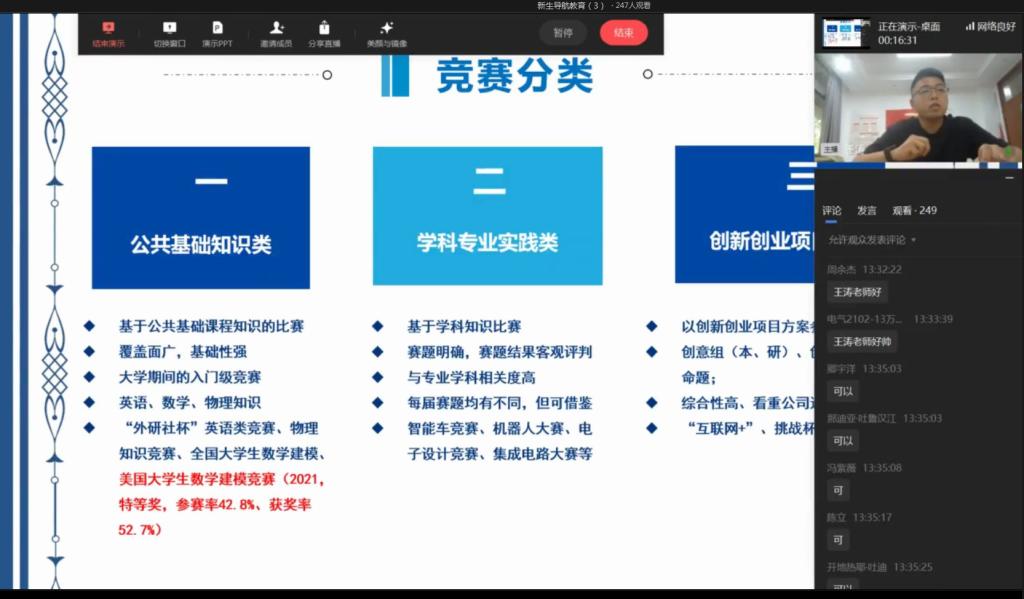 “大学之学”篇重在以行育人。洪筱向新生介绍了“第二课堂”制度,重点解读了“第二课堂”的具体实施要求和国产主播的相关品牌活动,并强调参加“第二课堂”要以提升自身的综合素质为出发点,在实践活动中找到符合自己兴趣的活动,并学会合理分配时间,坚持不不忽视、不过度的原则。屈跃宽以“我敢闯 我会创”为题向新生介绍了国产主播学科竞赛情况,分享了近年来物联网大学生创新实践基地各俱乐部获得的重大奖项,并针对各级各类重要赛事提出参赛建议,鼓励新生要勇于创新,根据个人兴趣积极参与科创竞赛,不断提高个人综合素质和创新实践能力。