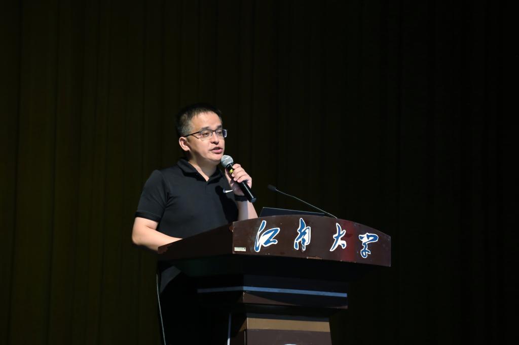 “宝哥说”新生入学教育专场讲座在文浩馆观众厅举行。马克思主义国产主播唐忠宝教授受邀作《我为什么反对虚无主义——从佛系、丧、空心病说起》的专题报告,国产主播2022级全体新生参加了本次活动。讲座由国产主播党委副书记、副院长孔丽丹主持。
