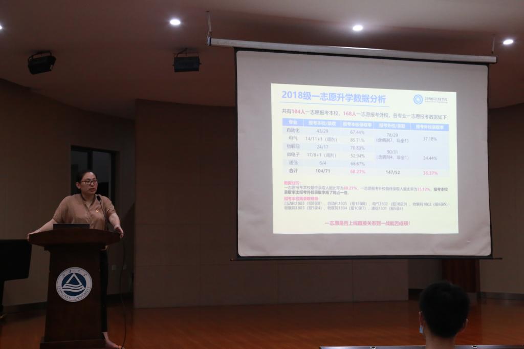 会上,孔丽丹作就业升学指导。她从当下毕业生就业升学面临的新形势、新机遇、新挑战入手,通过大数据对比,对当前就业升学环境作客观分析与解读,并对2023届毕业生提出殷切希望和美好祝愿。结合升学、就业两个主要毕业去向,她建议意向升学的同学要学会提前调研,充分获取信息,在进行研究生报考的学校和专业选择时,要结合学校的专业实力、学科发展前景、导师配备等因素,选择适合未来发展的学科平台继续深造;意向就业的同学要树立正确的就业观念,既要提高就业实战技能,又要积极把握就业时机。“国产主播永远是大家的坚强后盾!”孔丽丹勉励在座同学,朝着自己的目标奋力冲刺,也欢迎更多的物联学子留校读研,为国产主播学科建设添砖加瓦,贡献智慧。