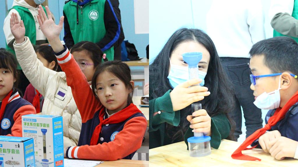 “哇!泥水变好清啦!原来一些小石子加上活性炭、滤纸就可以净化水啊!”志愿者引导队员们组装过滤装置,通过净水科学实验,队员们了解了水的性质与重要性,同时培养了他们对科学的认知与兴趣。