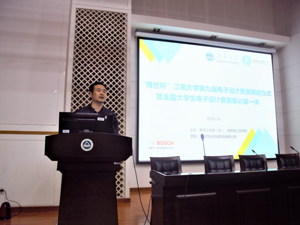 颁奖结束后,本届竞赛一等奖获得者段勤硕、辛娇杨、李显三位同学上台发表获奖感言,并与台下同学分享竞赛经验及收获。他们指出,电子设计竞赛过程虽艰辛劳累,但其中对个性品质和团队配合的历练使自身受益匪浅,特别是竞赛中在老师的指导下,攻克赛题难点,让参赛作品的指标达到更高水平等方面,对于攻坚克难意志品质的磨练,迎接挑战精神的激励以及提升电子设计综合素质,都具有十分重要的意义。颁奖仪式最后,竞赛指导老师朱凯元为同学们讲授了主题为“常用电子元器件的选用和焊装”的开班第一讲。