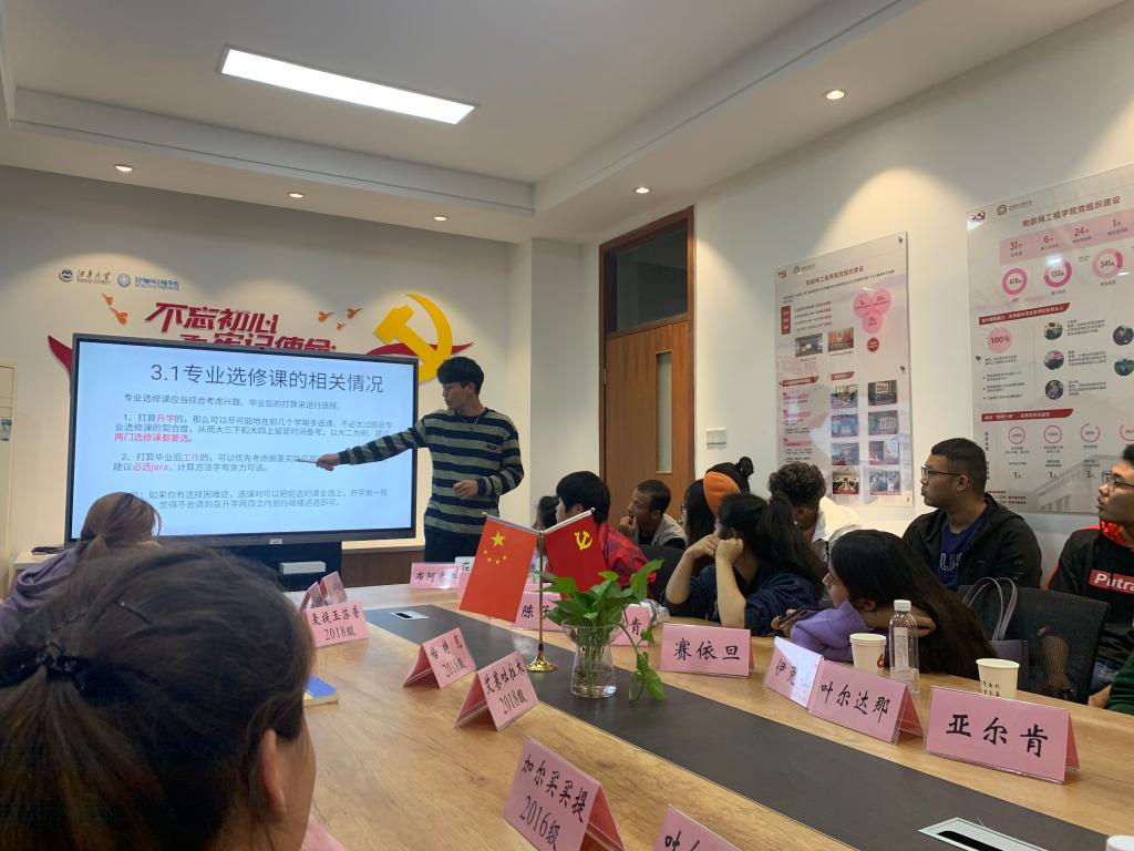 三年以来的深刻体会并祝学弟学妹们学业顺利,愉快地度过自己的大学生活!大学生退役返校学生艾赛吐拉木从他入学再到做入伍决定以及他艰苦又刻骨铭心的军旅生活,他感叹返校之后的江大翻天覆地的变化,并表示,很庆幸自己的青春有军装的样子!从预科班毕业再到物联网国产主播的2018级学生恰特克,通过幻灯片介绍关于计算机科学与工程专业满满的干货,将本次交流会的气氛带向高潮,现场同学都纷纷拿起手机拍下PPT上的内容,收益颇多。