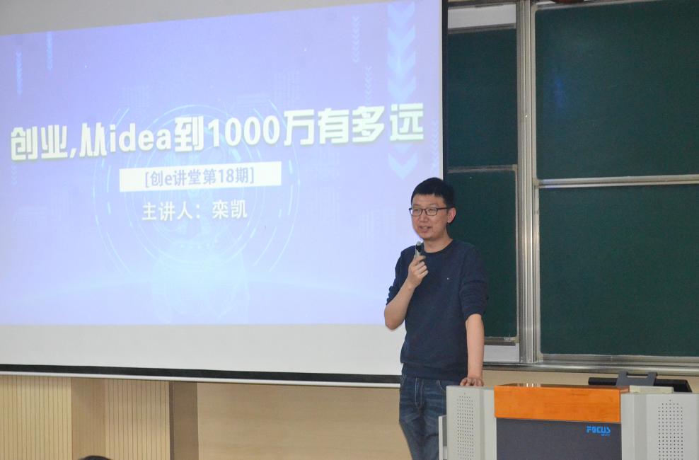 于一教B103成功开展了第18期创e讲堂活动。本次活动邀请了优秀校友栾凯作为嘉宾主讲,主题为“从idea到1000万有多远”。栾凯毕业于我校工商管理专业,是一名成功的连续创业者,现任无锡跑吧智能科技有限公司CEO。