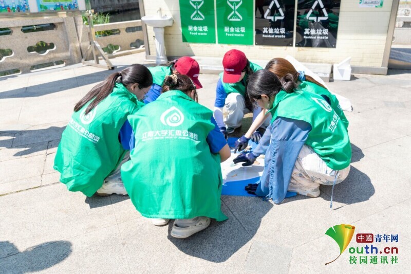 图为实践团成员对河内打捞以及河两岸捡拾上来的垃圾进行“垃圾鱼”创作过程。陈欣怡 供图